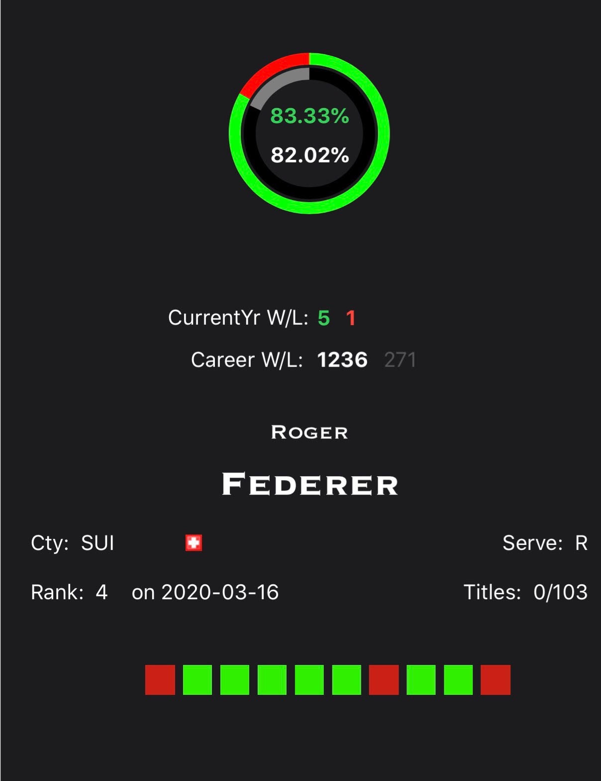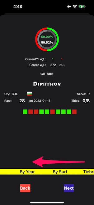 Then bar charts for Record by Year (this is a scrollable view); By Surface; another pie chart with career and year to date Tiebreak data. This is followed by the list of matches for the current year (with the option after it loads to display matches from previous years - just key in the 4 digit year and press 'Go'). This is followed by the career Ranking history. We use the Best/Worst ranking during a year (as opposed to Year End which favors some players over others).