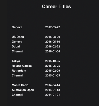 Rounding out the player data - 5 set record, record by round, record versus Top 10 players (another stat which really shows the difference between players), Deciding Set record for both the career and current year, miscellaneous data including longest Win and Loss Streaks and first Pro Level event. Finally a list of results over the last 52 weeks.